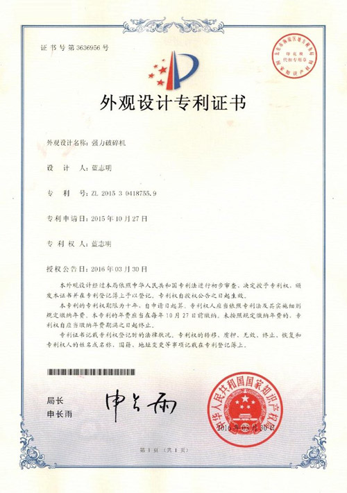 外觀(guān)專(zhuān)利證書(shū)(強(qiáng)力破碎機(jī))